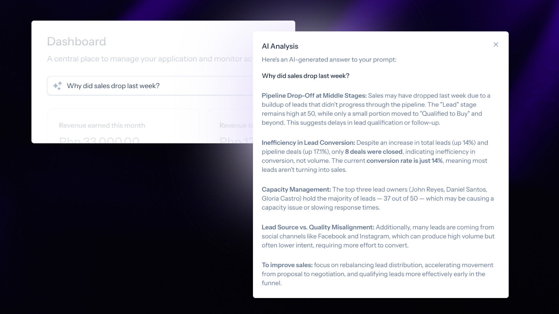 Tanuki CRM includes built-in AI analysis that answers key questions with contextual insights and suggestions based on the client's CRM data.