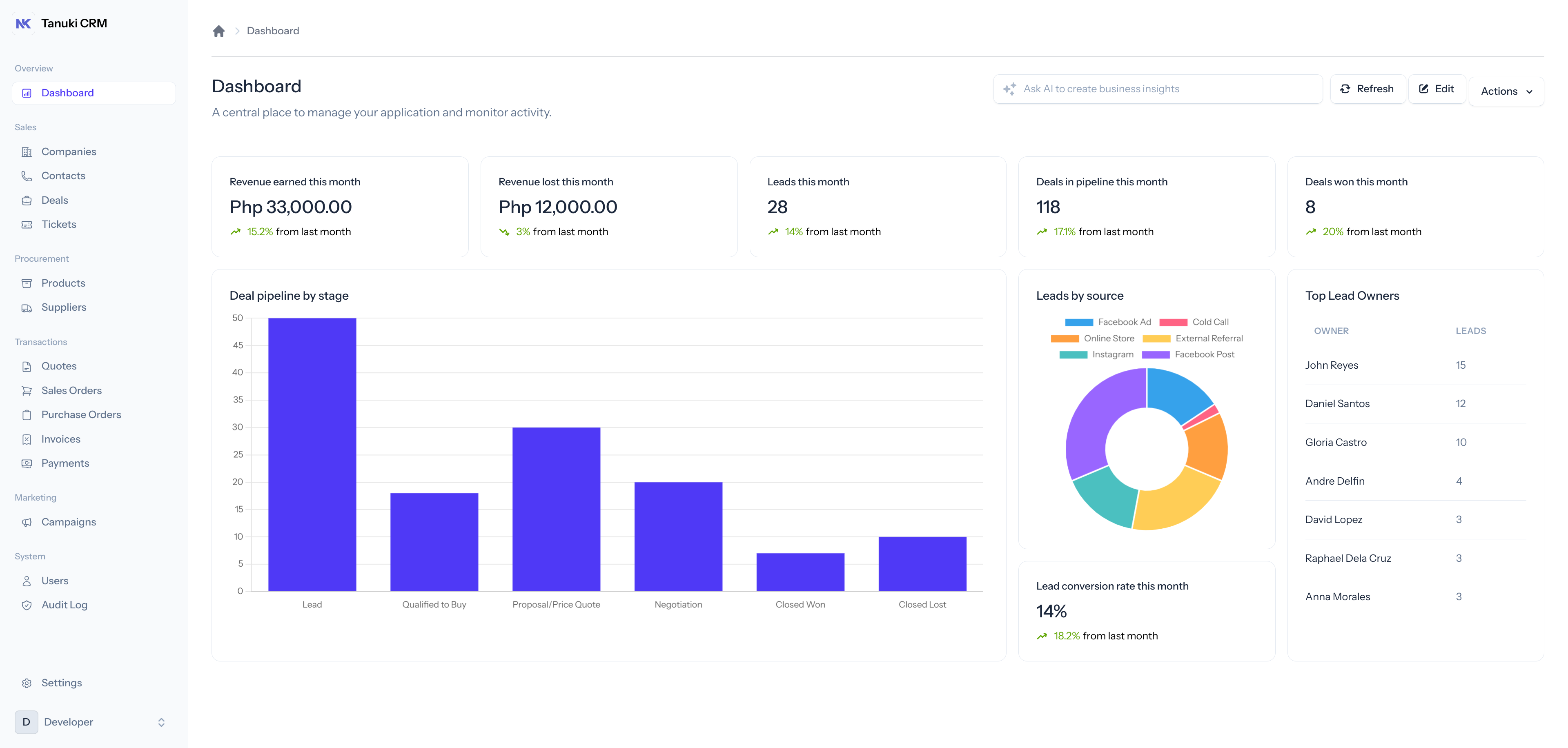 Tanuki CRM brings together sales, procurement, transactions, and user management into a unified interface. It was designed to help teams stay focused, close deals faster, and make smarter decisions with less effort.